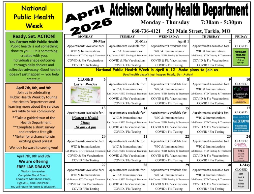 When: Monday – Thursday, Call 660-736-4121 to an appointment