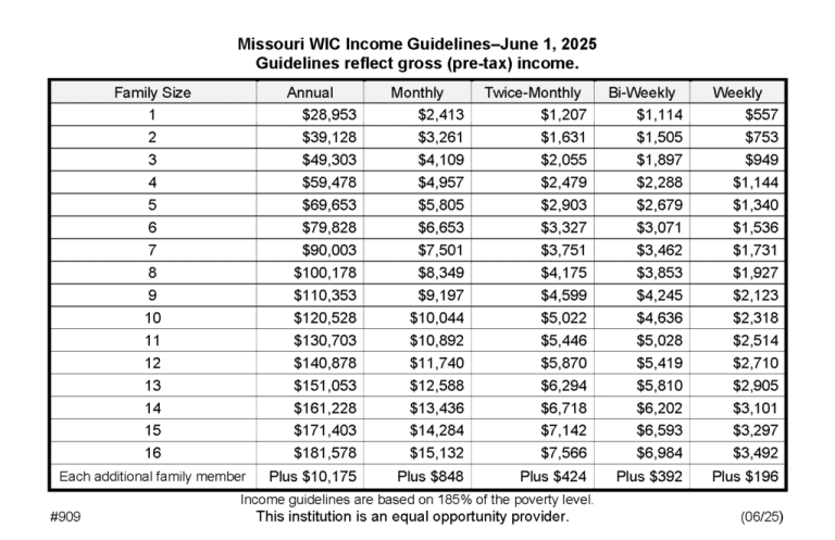 Women, Infants, and Children is a special supplemental nutrition program providing services to pregnant women, new mothers, infants, and children up to their 5th birthday based on nutritional risk and income eligibility. The primary services provided are healthy, supplemental food, risk assessment, nutrition education, and counseling, breastfeeding promotion and support, health screening, and referrals to health care. To be eligible for WIC, applicants must have an income of less than or equal to 185% of the poverty level and be at nutritional risk. Migrant families are also eligible. See income guidelines here: https://health.mo.gov/…/wic/pdf/income-guidelines.pdf